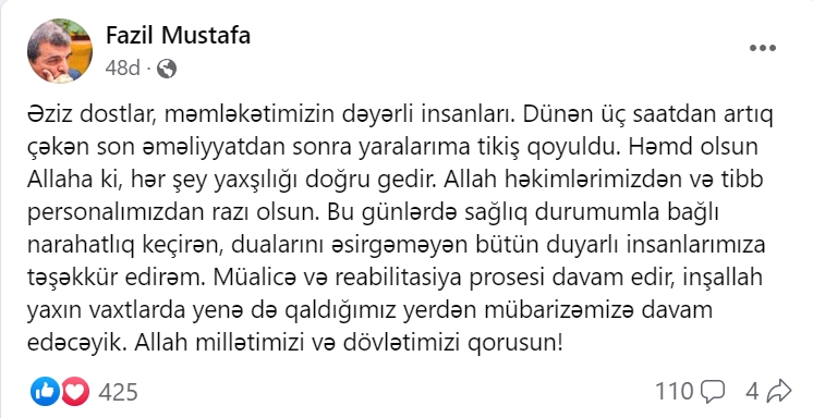 “Əziz dostlar, məmləkətimizin dəyərli insanları. Dünən üç saatdan artıq çəkən son əməliyyatdan sonra yaralarıma tikiş qoyuldu. Həmd olsun Allaha ki, hər şey yaxşılığı doğru gedir. Allah həkimlərimizdən və tibb personalımızdan razı olsun. Bu günlərdə sağlıq durumumla bağlı narahatlıq keçirən, dualarını əsirgəməyən bütün duyarlı insanlarımıza təşəkkür edirəm. Müalicə və reabilitasiya prosesi davam edir, inşallah yaxın vaxtlarda yenə də qaldığımız yerdən mübarizəmizə davam edəcəyik. Allah millətimizi və dövlətimizi qorusun”.