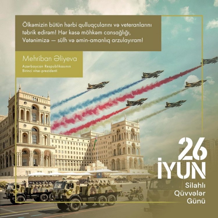 “Ölkəmizin bütün hərbi qulluqçularını və veteranlarını təbrik edirəm! Hər kəsə möhkəm can sağlığı, Vətənimizə sülh və əmin-amanlıq arzulayıram”.