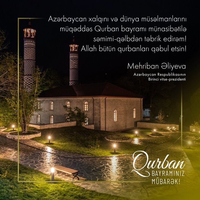 “Azərbaycan xalqını və dünya müsəlmanlarını müqəddəs Qurban bayramı münasibətilə səmimi-qəlbdən təbrik edirəm. Allah bütün qurbanları qəbul etsin!”.