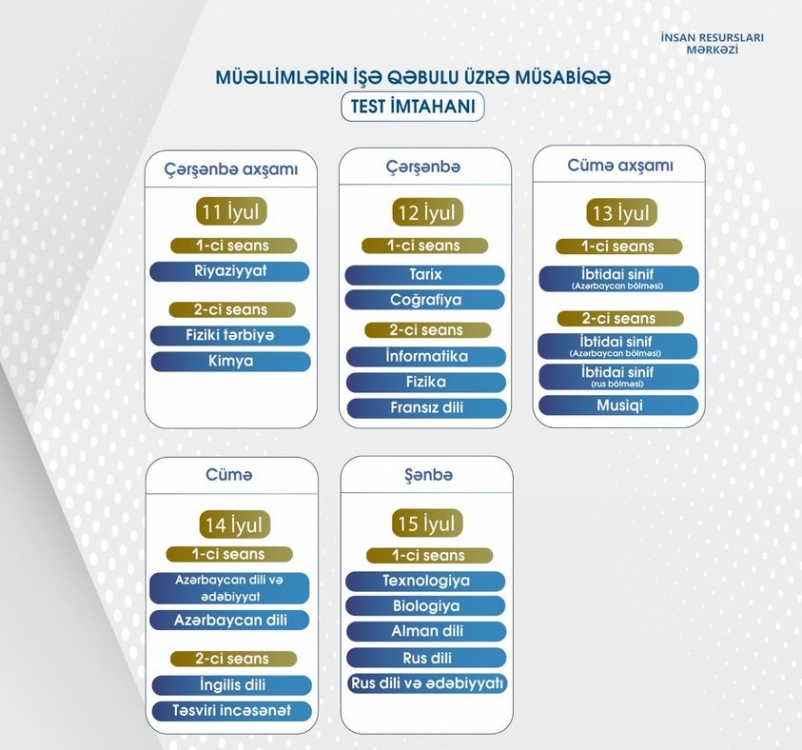 Qeyd edək ki, müəllimlərin işə qəbulu üzrə müsabiqənin test imtahanları 11-15 iyul tarixlərində 13 şəhərdə 29 imtahan mərkəzində keçiriləcək.